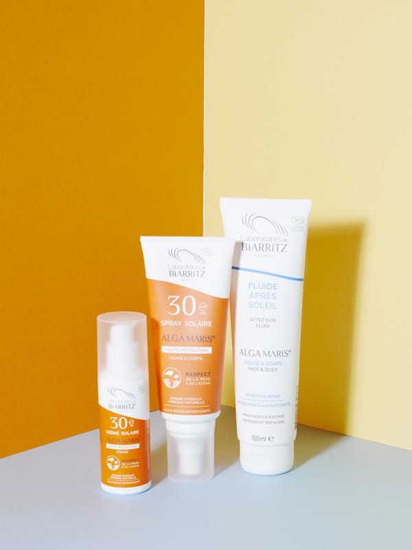 - La Crème visage SPF30/50. Elle assure une haute protection solaire naturelle : ses écrans minéraux haute tolérance protègent votre peau des rayonnements UVA et UVB et son extrait breveté d’algue rouge à la puissante action antioxydante préserve les cellules cutanées des effets néfastes des radicaux libres, dont le vieillissement prématuré. La formule non grasse de la Crème visage offre de véritables propriétés hydratantes et matifiantes. Elle sublime la peau et lui apporte confort et douceur.